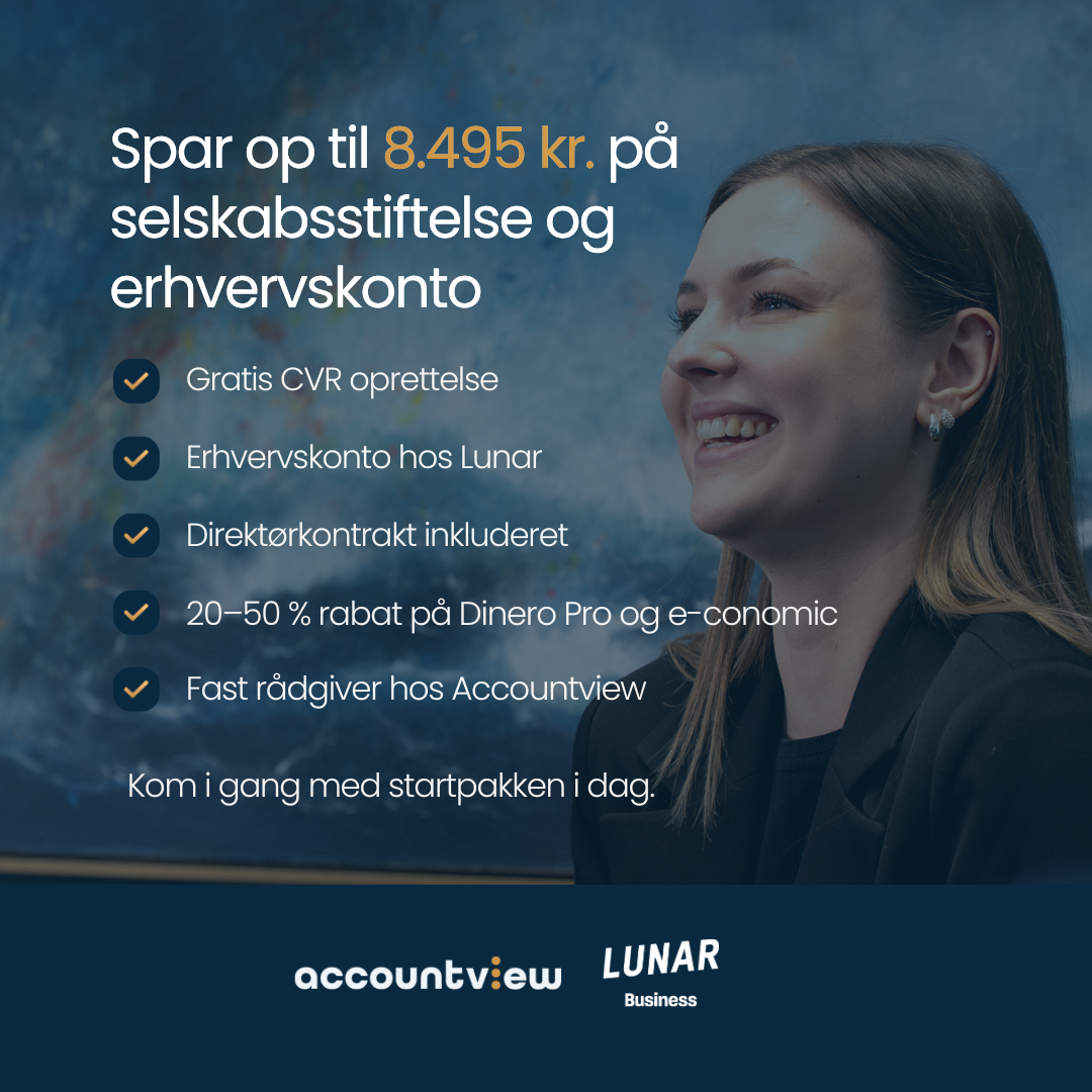 Få en god start på din virksomhedsdrøm ved at blive kunde hos Accountview og Lunar. Vi tilbyder en startpakke med det vigtigste du skal bruge for at komme godt i gang.